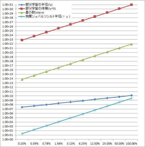 昨日の記事で宇宙の全質量を求め、かなりコンパクトな領域に収まってしまうことが分かりましたが、今回、宇宙全体がブラックホールになったときの大きさを計算してみました。物質だけで2.51E+03億光年(2510億光年)、ダークマター(DM)とダークエネルギー(DE)…